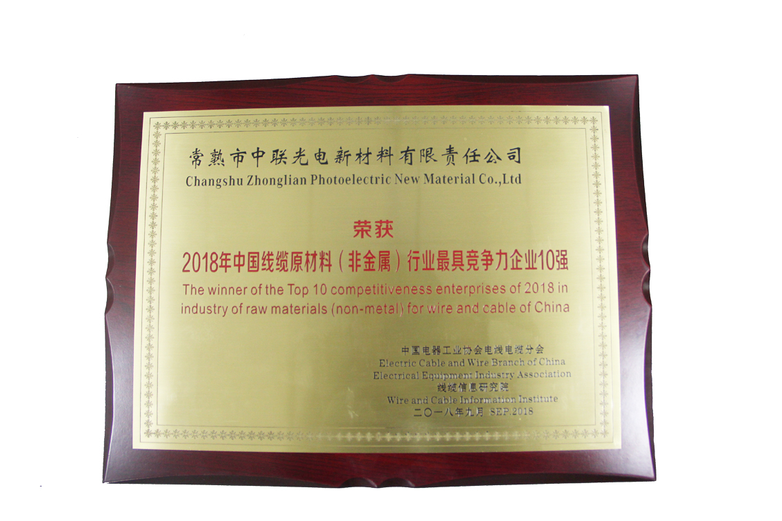 9月27日,2018中國(guó)電線電纜行業(yè)大會(huì)在上海召開(kāi),會(huì)上揭曉了《中國(guó)線纜原材料(非金屬)行業(yè)最具競(jìng)爭(zhēng)力企業(yè)10強(qiáng)》榜單。經(jīng)過(guò)各項(xiàng)嚴(yán)苛指標(biāo)的逐一檢驗(yàn),常熟中聯(lián)光電榮獲前四強(qiáng)。