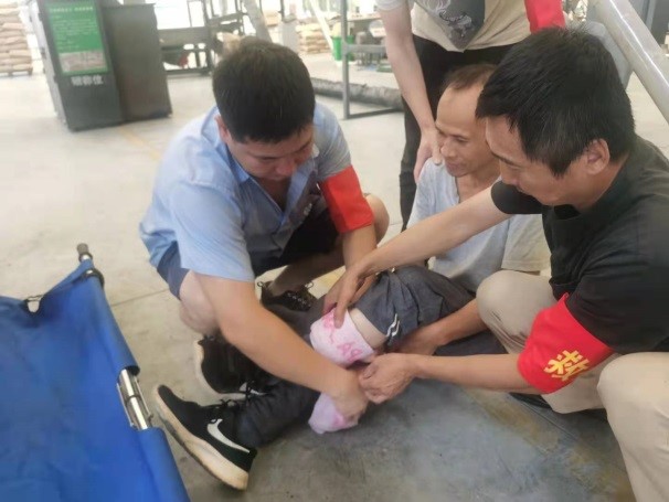 演練的第一項內(nèi)容:模擬車間人員腿部受傷后大量出血,車間應(yīng)急救護小組立即采取應(yīng)急包扎措施,緊急處置后進行傷員轉(zhuǎn)移。