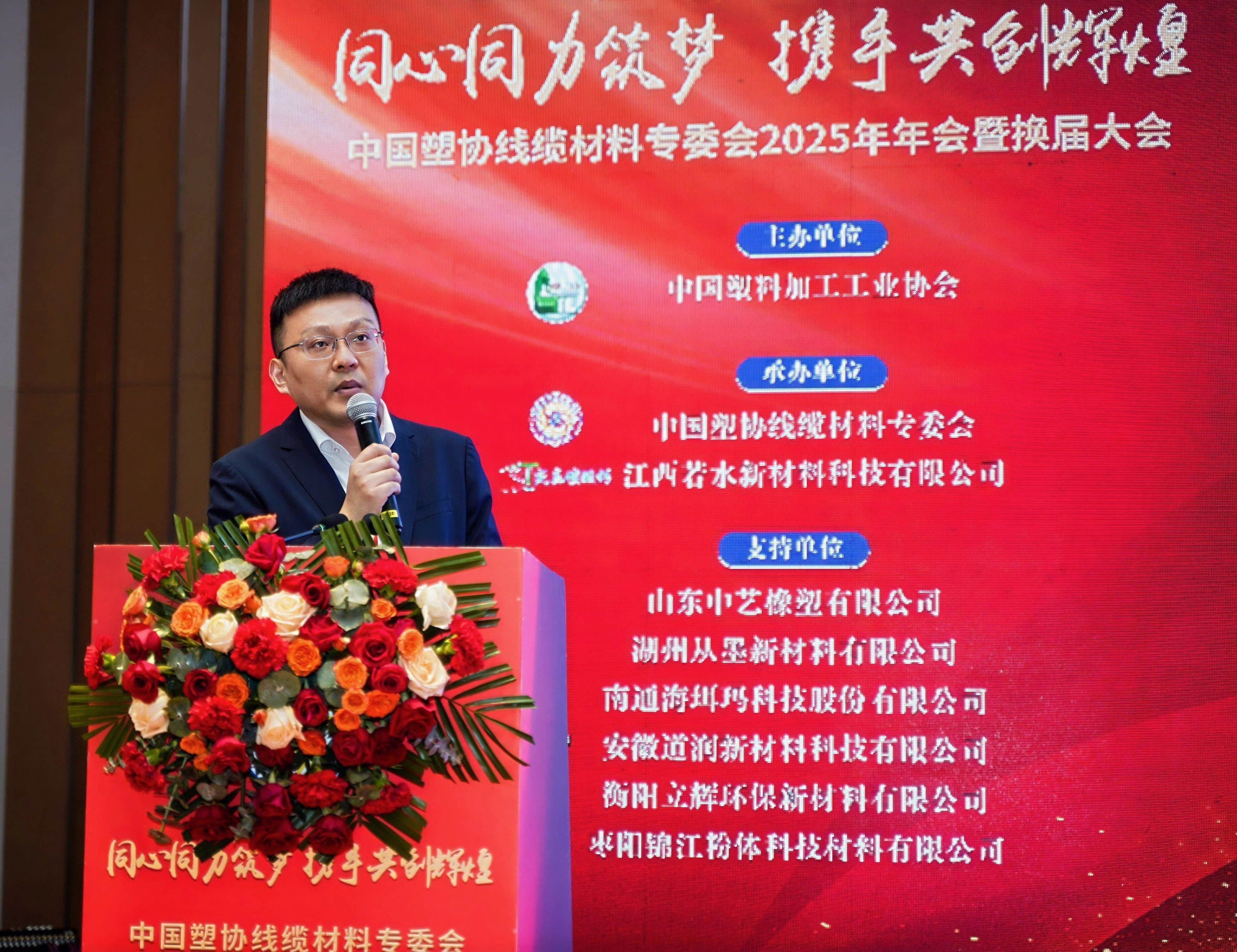 2025年4月8日至10日,中國塑協線纜材料專委會2025年年會暨換屆大會在江西吉安隆重舉行。常熟市中聯光電新材料有限責任公司常務副總裁姚志剛受邀參會,與行業專家、企業代表共議塑料加工產業創新與可持續發展。此次換屆,中聯公司憑借?持續領先的技術創新實力與突出的行業標桿作用,成功連任副理事長單位,這是協會對公司深耕線纜材料領域、引領產業升級貢獻的高度認可。