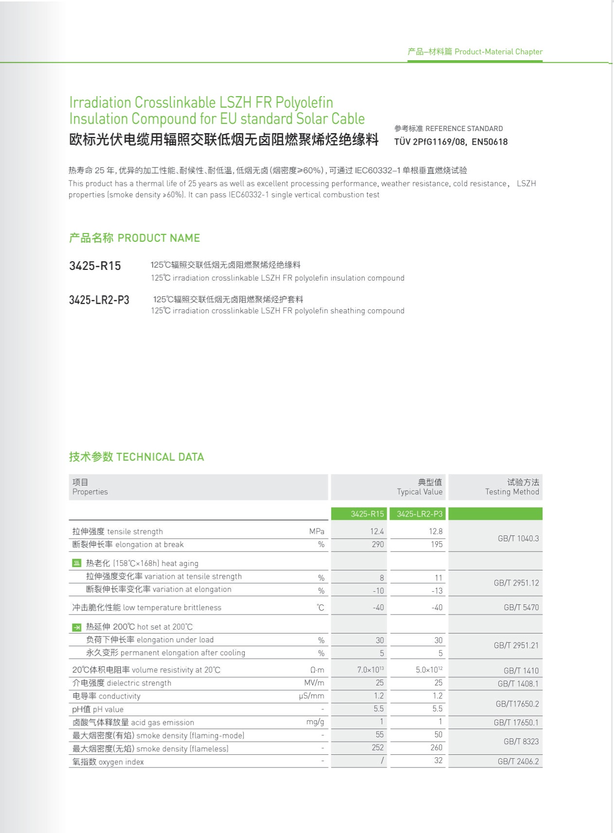 歐標光伏電纜用輻照交聯低煙無鹵阻燃聚烯烴絕緣料